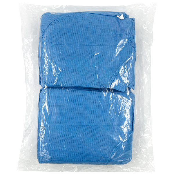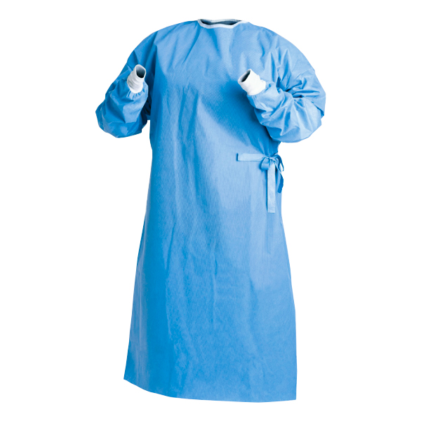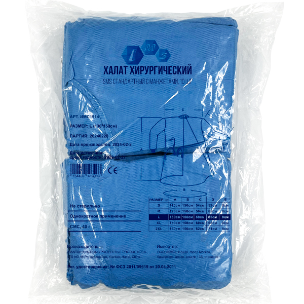 Халат хирургический с манжетами стерильный предназначен для хирургических вмешательств с умеренным количеством жидкости, изготовлен из нетканого материала типа "СМС", завязки на талии, на спине по горловине липучка.